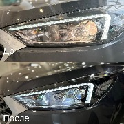 Заменили галогенные линзы на Bi-LED линзы, установили диодные лампы в ПТФ, отрегулировали, произвели полировку фар
